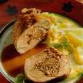 800 г бескостных бедрышек индейки 200 г шампиньонов 1 луковица 1 ст. ложка сливочного масла 2 ст. ложки рубленой петрушки 200 г печени индейки 3 ст. ложки растительного масла 250 мл белого вина 4 ст. ложки сливок соль, перец Лук и шампиньоны мелко нарезать. Лук пассеровать в сливочном масле, добавить грибы и жарить, пока не выпарится влага. Добавить петрушку. Мясо снаружи и изнутри посолить и поперчить. Грибную смесь приправить специями и вместе с печенью вложить внутрь мяса, соединить края и обвязать нитью. Нагреть духовку до 200°. Обжарить бедрышки в растительном масле. Влить вино и тушить под крышкой 1 ч. Жарить без крышки еще 20 мин., переворачивая и поливая соком. Влить в жидкость, оставшуюся от жаренья, сливки. Подавать с отварным картофелем.