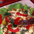 4 копченые куриные ножки 150-200 г брынзы 4 болгарских перца 1 яйцо 0,5 банки маслин 2 больших пучка салата немного майонеза Порезать мясо курицы длинными полосками, покрошить сваренное вкрутую яйцо. Добавить болгарский перец разных цветов, нарезанный полосками. Затем добавить брынзу, нарезанную мелкими кубиками, половинки маслин и порезанный листовой салат. Перед подачей на стол заправить небольшим количеством майонеза, учитывая, что из-за брынзы в салате образуется сок. Маслины в салате можно заменить оливками. Солить салат не нужно.