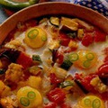 700 г баклажанов 500 г цуккини 2 луковицы 4 стручка красного сладкого перца 1 стручок чили 500 г картофеля 50 мл растительного масла 4 зубчика чеснока 250 мл бульона из кубиков 1 банка помидоров (850 мл) 4 яйца соль, перец Баклажаны и цуккини нарезать кубиками. Лук порубить. Чили нарезать кольцами, а картофель - кубиками. Сладкий перец разрезать вдоль пополам и положить на смазанный жиром противень срезом вниз. За пекать 10 мин при 200°, очистить от кожицы. В глубоком сотейнике нагреть масло и обжарить в нем до золотистого цвета картофель с луком, добавив пропущенный через пресс чеснок. Выложить помидоры, остальные овощи, влить бульон, посолить и поперчить. Тушить все вместе 10 мин. Сверху залить яйцами и запекать около 5-7 мин при 200°.