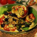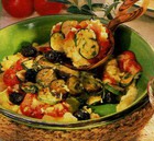 500 г картофельного пюре 1 зубчик чеснока 100 г брынзы 200 мл сметаны по 2 маленьких баклажана и цуккини 60 мл растительного масла 4 помидора 10 маслин 2 ст. ложки рубленой зелени 100 г тертого сыра гауда соль, молотый черный перец Горячее картофельное пюре взбить веничиком, добавив сметану, нарезанную маленькими кусочками брынзу и пропущенный через пресс чеснок, посолить и поперчить. Форму для запекания смазать жиром, выложить пюре и разровнять лопаткой. Нагреть духовку до 180°. Баклажаны и цуккини очистить, нарезать кружками и обжарить порциями в горячем растительном масле. Помидоры обдать кипятком, очистить от кожицы и нарезать кружками. Равномерно разложить овощи и маслины поверх пюре, посыпать сыром и зеленью. Запекать около 35 мин.