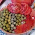1 стакан риса 6 стручков сладкого перца 200 г консервированного зеленого горошка 2 помидора 2 столовые ложки сока лимона 2 столовые ложки растительного масла черный молотый перец соль - по вкусу Перебрать и промыть рис, отварить его в большом количестве кипящей подсоленной воды до рассыпчатого состояния. Откинуть рис на дуршлаг, промыть струей холодной воды и поставить обсушиться. Сладкий стручковый перец промыть, очистить от семян и нарезать вдоль на полоски. Добавить рис, зеленый консервированный горошек без сока, посолить, поперчить, заправить растительным маслом и соком лимона, перемешать и выложить в салатник. Нарезать помидоры кружочками и украсить ими салат.