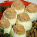 6 яиц 150 г мясного паштета 1/2 пучка укропа 1/2 пучка зеленого лука 1/2 пучка петрушки 1/2 банки майонеза 1/2 банки зеленого горошка (маленькая) 1 небольшой красный болгарский перец для украшения блюда Яйца отварить, охладить, очистить от скорлупы и разрезать вдоль. Желтки вынуть и сложить в удобную для растирания посуду. Добавить майонез и тщательно растереть - это есть основной ингредиент. Добавить по вкусу зелени - лук зеленый, петрушку, укроп, эстрагон, лук репчатый (сырой или пассерованный), сыр твердых сортов, натертый на мелкой терке; рыбу - селедку, консервированную (лосось, сайра, скумбрия, шпроты), горячего или холодного копчения ветчину, колбасу любую, шампиньоны свежие, соленые, маринованные, жареные. Общий объем добавок должен быть меньше объема желтка. Все добавки тщательно перемешать с желтком и майонезом, заполнить белки до объема целого яйца. На тарелку уложить зеленые листья салата, на каждый листок дольку красного перца, срезанную поперек, а на нее установить фаршированное яйцо. Сверху яйцо слегка полить майонезом.