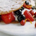 250 г клубники (ягоды разрезать на половинки) 130 г черники сок (или рюмка ликера) и цедра одного апельсина 2 столовые ложки сахарного песка 4 песочных печенья 500 г сыра рикотта (или творога) 125 г сахарного песка (для сыра) 1 чайная ложка корицы сахарная пудра Осторожно перемешай ягоды с сахаром и апельсиновым соком и дай им пропитаться. Сыр хорошо разомни и смешай с сахаром, корицей и апельсино вой цедрой. Подавая к столу, на тарелочку с печеньем сначала положи ягоды, потом сырную массу и опять ягоды. Сверху посыпь сахарной пудрой.