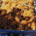 450 г макаронных изделий 1,5 ст. ложки оливкового масла 1 луковица (мелко нарезать) 1 зубчик чеснока (измельчить) 1 острый красный перчик (очистить от семян и мелко нарезать) 0,5 кг говяжьего фарша 2 ст. ложки томат-пасты 1 ч. ложка сахарного песка 1 ст. ложка острого томатного соуса 150 мл мясного бульона (можно из кубика) 400 г помидоров 200 г банка консервированной фасоли (воду слить) сыр для посыпки Обжарить лук с чесноком и перцем. Добавить мясной фарш и обжаривать еще 5-6 минут. Положить специи, томат-пюре, мелко нарезанные помидоры, сахар, влить бульон, довести до кипения и тушить 30 минут. Добавить сюда же фасоль и готовить еще 10 минут. Отварить макароны. Смешать с приготовленным фаршем, выложить в огнеупорную форму, приправить, посыпать сыром и запекать в духовке, пока сыр не расплавится.
