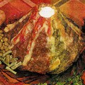 куриное мясо - 250-300 г картофельное пюре - 300 г сырой мясной фарш - 300-350 г кетчуп и майонез - по вкусу Мясо отварной курицы в форме пирамиды выложить на огнеупорное блюдо. Отдельно приготовить крутое картофельное пюре и аккуратно облепить нашу пирамиду. Сверху третьим слоем обмазать сырым мясным фаршем (мясо, соль, перец, лук, чеснок). В центре «вулкана» сделать кратер - вставить пустую скорлупку от яйца (острый кончик), запечь в духовке около 40 минут. Затем скорлупу убрать, в кратер влить немного спирта. Спирт поджечь. Вулкан со всех сторон украсить «лавой» - кетчупом и майонезом.