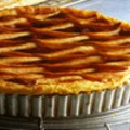350 г сладкого заварного теста Для крема: 1/4 л молока ванилин 2 яичных желтка 60 г сахарного песка 15 г пшеничной муки 15 г кукурузной муки тонкого помола 30 г сливочного масла Для песочного теста: 250 г муки 125 г сливочного масла 6 г соли 6 г сахарного песка 1/2 яйца 1 яйцо для смазывания теста 100 г воды Крем: вскипятить молоко с ванилином и сахаром. В миске веничком смешать пшеничную и кукурузную муку с желтками. Постепенно влить кипяченое молоко, перелить смесь в кастрюлю, поставить на огонь и довести до кипения, не переставая помешивать. Положить сверху несколько кусочков сливочного масла, остудить. Песочное тесто: замесить тесто из муки, сливочного масла, соли и сахара, половинки взбитого яйца и небольшого количества воды. Сделать шар, затем раскатать его скалкой и выложить в форму. Обрезки коржа сохранить. Смешать в миске равное количество крема и заварного теста. Выложитть полученную смесь в форму поверх слоя песочного теста так, чтобы в центре получился небольшой «бугорок» высотой 3-4 мм. Из оставшегося песочного теста вырезать 8 полосок шириной 3 мм. Уложить их на торт «плетенкой», смазать взбитым яйцом. Поставить в духовку, нагретую до 180°С на 25-30 минут. Подавать к столу теплым. По желанию можно посыпать пудрой или смазать малиновым джемом.