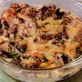 свинина - 600 г масло растительное - 3 ст. ложки грибы - 120 г 2 яйца 60 г сыра молоко - 1/2 стакана соль, перец зелень чеснок Свиную вырезку или корейку нарезать тонкими кусками, обжарить с обеих сторон до мягкости. Грибы (можно использовать замороженные и сушеные, только предварительно замоченные) пережарить на растительном масле. Сложить обжаренные куски на сковороду или противень. Сверху на мясо положить обжаренные грибы, разровнять, осторожно залить смешанными с молоком яйцами. Посыпать тертым сыром и запечь в духовке до румяной корочки. При подаче на стол выложить аккуратно на блюдо на листья салата, посыпать сверху мелко нарубленной зеленью, смешанной с рубленым чесноком.