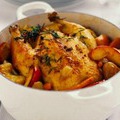 2 небольших цыпленка 5 зеленых яблок 1 ч. л. соли 1 ч. л. корицы 4 ст. л. масла (сливочного или растительного) Цыплят обработать, каждую тушку разрезать на 4 части, обжарить на сковороде в раскаленном масле. Обжаренные кусочки положить в гусятницу или другую углубленную посуду. Яблоки разрезать на части, вынув сердцевину. Обложить ими цыплят, чтобы они их покрывали полностью. Посыпать корицей, закрыть посуду крышкой и поставить в духовку на 1 час. Готовое блюдо должно зарумяниться.