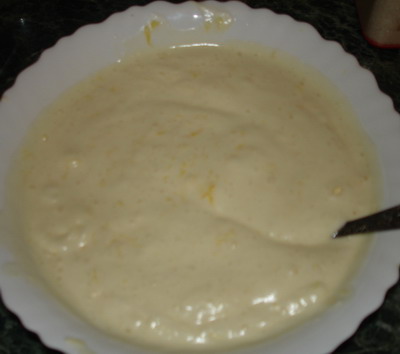 Взбить белки с щепоткой сахара. Добавить апельсиновую мякоть и крахмал. Взбить полученную массу.