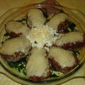 Уложить лепестки ромашки. В центр положить круглую котлету и посыпать ее тертым желтком.
