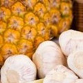1 банка консервированных ананасов 200-300 г твердого сыра 4-5 яиц 1 долька чеснока майонез Ананасы порезать кусочками, сыр натереть на терке, яйца отварить и мелко порезать, выдавить чеснок (или измельчить). Все смешать и добавить майонез.