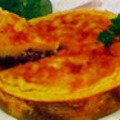 Отварить и растереть 1 картофелину, добавить 1,5 ст. л. горячего молока, 1/5 сырого яйца, немного соли и перемешать. Половину смеси положить на дно смазанной сливочным маслом сковороды, сверху выложить слой потушенного с луком фарша и вторую половину картофельного пюре. Разровнять, смазать сметаной и поместить в духовку на 20 минут.