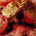 3-4 небольших помидора, 1 небольшой лимон, 2 очень мелко нарубленных зубчика чеснока, 1 ст. л. оливкового масла, 1 ч. л. соли, 1 ч. л. сухого орегано, 1/4 ч. л. крупномолотого черного перца, кусок костреца (примерно 750 г). Натереть цедру с лимона и выжать из него сок. Смешать в форме для микроволновой печи размером 30x21 см лимонную цедру, лимонный сок, чеснок, масло, соль, орегано и перец. Положить мясо в форму, перевернуть его несколько раз. Положите мясо на решетку в сковороде. Поставьте ее на огонь. Жарить мясо с двух сторон 12-15 минут, смазав его маринадом после переворачивания. Довести до готовности в духовке. Переложить мясо на блюдо. Дать полежать 10 минут. На жире, оставшемся от мяса, обжарить разрезанные пополам помидоры. Перед подачей на стол тонко нарезать мясо. Сверху полить соком со сковороды и оформить помидорами и зеленью.
