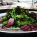 Маринад для утиной грудки: масло кунжутное, масло оливковое, соус соевый. Малиновая заправка: пюре малины, уксус малиновый, масло кунжутное микс-салат (фризе, руккола, маш-салат, листья свеклы), утиная грудка Утиную грудку замариновать в соевом соусе с кунжутным маслом. Затем обжарить до готовности на гриле. Нарезать тонкими ломтиками. В центр тарелки укложить микс-салат, который заправить малиновым соусом. Вокруг уложить утиную грудку.