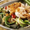 окорочок - 400 г яйцо - 2 шт. свежий огурец - 2 шт. пучок зеленого лука чеснок немного уксуса готовая горчица соевый соус жареное кунжутное семя Окорочок отварить, мясо расщипать на тонкие волокна. Яйца взбить и зажарить на маленькой сковороде 2 блинчика. Огурец нарезать полукольцами, соединить с курицей, добавить зеленый лук, чеснок, уксус, горчицу, соевый соус и жареное кунжутное семя. Все перемешать и убрать на 1 час в холодильник. Перед подачей украсить тончайшей лапшой из яичных блинчиков.