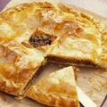 Отварить в подсоленной воде картофель. Воду слить, картофель размять, как для пюре. Добавить 2-3 яйца, 100-150 г сливочного масла и столько муки, чтобы можно было замесить картофельное тесто. Подготовить три начинки: 1. любые грибы, отваренные в подсоленной воде и обжаренные с измельченным луком в растительном масле; 2. мелко рубленные вареные яйца, смешанные с измельченным зеленым луком и заправленные растопленным сливочным маслом; 3. мясной фарш, обжаренный в растительном масле до готовности. В глубокую сковороду выложить большую часть теста, разравнивая его руками так, чтобы оно прикрыло и бортики. Затем поочередно ложкой положить слоями первую, вторую, третью начинки. Сверху накрыть второй частью теста, смазать сливочным маслом и запечь в духовке на умеренном огне до румяной корочки.