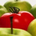 Заполнить 3-литровую банку помидорами, пересыпая дольками яблок, по бокам положить полоски сладкого зеленого перца, веточку петрушки. Залить на 5 мин. кипятком, затем слить и на этой воде сварить маринад, добавив 1 ст. л. соли, 5 ст. л. сахара и 50 г 6% уксуса. Залить маринадом, закатать.