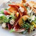 2 яйца 2 персика 300 г отварного мяса 100 г зеленого горошка 1 средняя небольшая спаржа майонез 1 апельсин соль, зелень 1 луковица Нарезать мясо соломкой, персик (без косточки) и отваренную спаржу - кубиками. Лук мелко порубить. Сложить все в салатницу, добавить туда горошек, рубленое яйцо и майонез. Осторожно перемешать. Украсить дольками апельсина и зеленью.