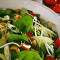 200 г молодого шпината 2 свежих огурца 2 свежих помидора 100-120 г зеленого лука 2 яйца 1/2 стакана майонеза 1/2 стакана сметаны Шпинат промыть, нарезать соломкой. Огурцы, помидоры нарезать тонкими ломтиками, сваренные вкрутую яйца мелко порубить, лук нашинковать. Все продукты смешать в салатнике, добавить зеленый лук. Майонез смешать со сметаной и заправить салат.