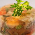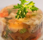 1-1,5 кг говядины 500 г телячьих ножек 150-200 г сала-шпик 1 морковь петрушка, сельдерей 1 луковица 2-3 ст. л. сливочного масла лавровый лист перец, соль Очищенную и промытую говядину нашпиговать салом-шпиком, обжарить со сливочным маслом и тушить с бульоном или водой до готовности. Добавить мелко нарубленные телячьи ножки, нарезанные и слегка обжаренные морковь, петрушку, сельдерей, лук, соль, перец и лавровый лист. Для приготовления желе мясо вареных телячьих ножек вместе со сваренными кореньями протереть через сито (мясорубку), залить соком, полученным при тушении мяса, добавить замоченный желатин (60 г на 1/2 стакана воды), хорошо перемешать, довести до кипения и процедить. Нарезанное тонкими ломтиками тушеное мясо положить в глубокое блюдо, залить подготовленным желе и оставить в холодном месте для застывания.