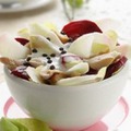 150-200 г дыни 3 яблока сладких сортов 4 груши по 200 г сливы и черешни (можно вишни сладких сортов) 1/2 стакана сметаны или немного взбитых сливок 50 г сахара Очистить яблоки от кожуры, если это необходимо. Удалить семена из всех плодов. Порезать их не очень мелкими кусочками и засыпать сахаром. Дать некоторое время постоять, чтобы они пропитались сахаром. Через 15-20 мин залить сметаной или взбитыми сливками.