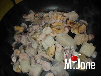Сверху выложить обжаренный морской коктейль. Смазать майонезной заправкой.