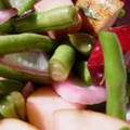5 небольших картофелин 1 свекла 1 стакан отваренной стручковой фасоли пряности по вкусу 2 ст. ложки уксуса 3 ст. ложки растительного масла Сварить картофель, сварить свеклу, охладить. Все нарезать ломтиками, добавить фасоль, посолить, поперчить, добавить пряности (по желанию заправить растительным маслом и уксусом). Все хорошо перемешать, и выложить в салатник. Украсить зеленью. В салат можно добавить красный лук.