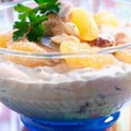 0,5 кг сельди 3 яйца 1 яблоко 1 мандарин 1 луковица 12-15 шт. грецких орехов 3 ст. ложки майонеза Филе сельди, вымоченное в холодном молоке, очищенные грецкие орехи, очищенное яблоко, сваренные яйца, пассерованный лук пропустить через мясорубку, заправить майонезом, перемешать и выложить в салатницу горкой, украсить зеленью, дольками мандарина, а можно и зеленым горошком.