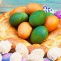 40 г дрожжей 100 мл молока 40 г сахара 120 г масла 140 г сахара лимонная цедра 1/2 ч.л. аниса соль 200-250 мл молока 4 яйца 180 г изюма 650-700 г муки 5 вкрутую сваренных и разноцветно окрашенных яиц Из дрожжей, 100 мл молока, 40 г сахара и небольшого количества муки сделать опару, дать ей подойти. В глубокую миску всыпать муку, сделать в ней ямку. В нее положить опару, яйца, соль, лимонную тертую цедру, изюм, анис, сахар, растопленное масло, оставшееся теплое молоко и замесить средней густоты гладкое тесто. Прикрыть миску полотенцем и оставить подходить. Подошедшее тесто разделить на 3 части, скатать каждую и опять дать подойти. Потом из каждой части теста сделать длинные полоски и сплести косу. Косу перенести на смазанный противень и соединить ее концы так, чтобы получился венок. Вареные крашеные яйца воткнуть в середину венка, печь в средне нагретой духовке 40-45 минут.