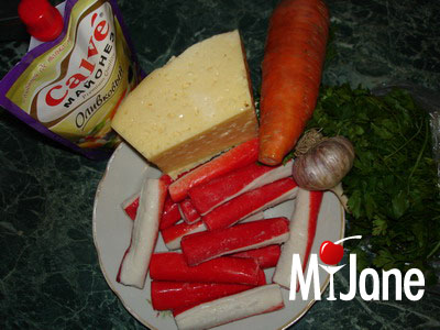 12 шт. крабовых палочек 2-3 дольки чеснока 200 г сыра 1 свежая морковь 2-3 отварных яйца майонез зелень Крабовые палочки должны хорошо разворачиваться. Лучше всего покупать не в пачках, а замороженные развесные.