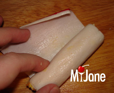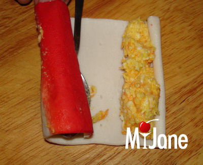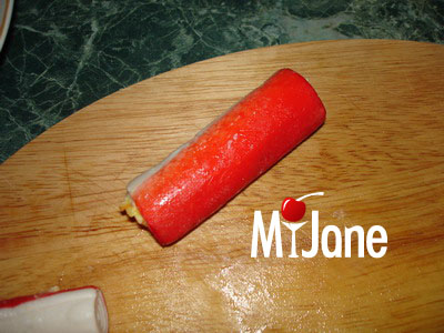 Крабовые палочки разморозить, раскрутить. Чайной ложкой положить салат в середину и аккуратно закручивать, придавая прежнюю форму.
