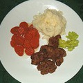 200-250 г картофеля 50 г печенки телячьей 10 г муки пшеничной 10 г масла сливочного 50 г мясного бульона соль Очищенный картофель вымыть, сварить на пару. Горячий картофель размять вилкой, посолить и развести горячим мясным бульоном (2-3 ст.л.). Поджаренную тонкими ломтиками печенку разрезать на мелкие кусочки. Все красиво уложить на тарелке, украсить овощами и зеленью или зеленым горошком.