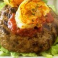 0,5 кг мясного фарша ломтик размоченной в молоке булки 1 большая луковица 1 яйцо 2 больших помидора 150 г сыра соль черный молотый перец - по вкусу Смешать фарш с булочкой, измельченными луком и яйцом. Сформовать 8 больших котлет, в каждой из них сделать углубление. На сковороде обжарить в растительном масле котлеты с одной стороны и выложить на противень. Помидоры обдать кипятком, снять кожицу, нарезать кубиками. Сыр тоже нарезать кубиками и смешать с помидорами. Положить смесь в углубление в котлетах. Запекать в духовке 10 мин., чтобы сыр расплавился. При подаче выложить на блюдо, выстеленное листьями, полить кетчупом.