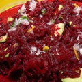 1 крупная свекла 4-5 шт. чернослива растительное масло несколько капель лимонного сока 1/2 ч.л. сахара Вареную в кожуре свеклу очистить, натереть на крупной терке, добавить мелко нарезанный чернослив (предварительно его надо распарить и вынуть косточки, если есть), растительное масло, несколько капель лимонного сока, если свекла несладкая, добавить сахар.