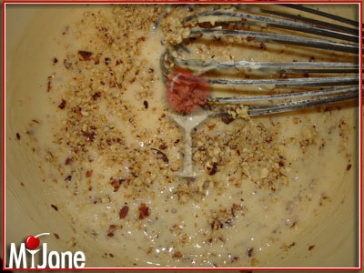 Сделать 1 корж: 1 яйцо, 0,5 стак. сахара, 0,5 стак. сметаны, 0,5 стак. муки, немножко соды, дробленые орешки.