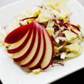 2 картофелины 2 моркови 2 луковицы 2 яйца 1 яблоко грецкие орехи молотые майонез Картофель отварить, охлаждить и нарезать кубиками. Морковь отварить и натереть на мелкой терке. Лук ошпарить и нарезать мелкими кубиками. Яблоко очистить, нарезать кубиками. Яйца отварить и нарезать кубиками. Все ингредиенты смешать, заправить майонезом, сверху посыпать орехами, украсить дольками яблока.