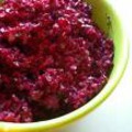 500 г свеклы 1 ч.л. тертого хрена 1 соленый огурец 3-4 зуб. чеснока майонез горсть измельченных грецких орехов соль зеленый лук Свеклу отварить, очистить, натереть на крупной терке. Соленый огурец натереть на мелкой терке, смешать со свеклой, тертым хреном, толченым чесноком, орехами, мелко нарезанным зеленым луком, посолить и заправить майонезом.