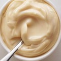 250 мл оливкового масла 2 яичных желтка 1 ч.л. яблочного (винного) уксуса 1/4 ч.л. горчицы перец и соль по вкусу В глубокой миске смешать желтки, горчицу и уксус, добавить соль. Затем все это взбить венчиком по часовой стрелке до получения однородной массы. Во время взбивания медленно и непрерывно тонкой струей вливать масло до образования густой консистенции майонеза. При желании можете добавить в майонез любимые приправы: кусочки чеснока, лука или зелень укропа.
