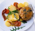 400 г мяса 100 г черствого белого хлеба 100 г молока 250 г лука мука 1 яйцо 50 г сухарей 50 г жира для обжаривания соль по вкусу зелень Мясо пропустить через мясорубку, соединить с замоченным в молоке хлебом, добавить соль, перец, еще раз пропустить через мясорубку и перемешать. Эту массу сформировать в виде лепешек толщиной в 1 см, на середину которых положить фарш. Затем края лепешек соединить, обвалять в сухарях, придавая овальную форму, обжаривать на жире. Фарш: мелко нарезанный лук обжарить до золотистого цвета, смешать его с мелко нарезанной петрушкой и мелко рублеными отварными яйцами.
