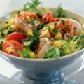 500 г отварных креветок 1 помидор 1 огурец 250 г свежей красной капусты 1 банк. кукурузы зеленый лук 150 г маринованных грибов зелень соль легкий майонез Креветки очистить. Капусту тонко нашинковать. Помидоры нарезать кубиками, а огурец - соломкой. Лук тонко нарезать. Все перемешать, посолить, добавить нарубленную зелень и заправить майонезом.