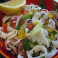 500 г кальмаров 1 большой куриный окорочок 200 г шампиньонов 1 большая луковица 100 г сыра зелень майонез Кальмары отварить, нарезать соломкой. Отварной окорочок разобрать по волокнам. Репчатый лук нарезать полукольцами и обжарить в масле. В этом же масле обжарить нарезанные шампиньоны. Все ингредиенты смешать с салатнике, добавить рубленную зелень, тертый сыр и заправить майонезом.