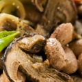 1 стак. фасоли (красной или белой) 400-500 г шампиньонов 200-250 г тертого сыра 1 луковица 4 ст.л. соевого соуса масло растительное зелень лавровый лист соль Фасоль замочить на сутки. Отварить фасоль в той же воде, пока фасоль не станет мягкой (около 1 часа). Грибы порезать, отварить в подсоленной воде. На сковороде разореть масло, выложить фасоль с добавлением 3-4 ст.л. бульона, добавить грибы с таким же колчисетвом бульона и соевый соус. Тушить под крышкой 15 минут. Затем добавить нарезанный полукольцами лук и лавровый лист. Оставить на огне еще на 5 минут. Готовое блюдо обильно посыпать сыром и зеленью. Накрыть крышкой и оставить на 10 минут, затем подавать.