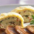 1,5 кг картофеля 300 г шампиньонов 200 г крахмала 2 луковицы 2 ст.л. сметаны сливочное масло жир 1 ст.л. панировочных сухарей соль, перец - по вкусу Картофель очистить и отварить в подсоленной воде, размять его в пюре, добавить крахмал, немного молока, еще посолить и замесить тесто. Шампиньоны нарезать ломтиками, лук - полукольцами. Все обжарить на сливочном масле, посолить, поперчить, добавить сметану и перемешать. Картофельное тесто раскатать толстым слоем, выложить на него грибной фарш, свернуть тесто в рулет и тщательно защипнуть края. Рулет уложить на пропитанную маслом пергаметную бумагу, поверхность смазать слегка взбитым яйцом и посыпать сухарями, сверху рулет полить растопленным сливочным маслом. Запекать в духовке в течение 20-25 минут при температуре 180С.