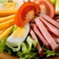 1 болгарский перец 2 помидора 2 яйца 200 г сыра (полутвердого) 200 г ветчины соль листья салата майонез Перец, сыр и ветчину нарезать соломкой, помидоры и яйца - дольками. На листья салата выложить все ингредиенты, посолить, заправить майонезом.