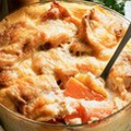 300 г картофеля 4 шт. филе лосося 150 г сыра 1 стак. рубного бульона 100 мл сливок (10%) 100 мл белого вина сливочное масло сок 1/2 лимона 1 зуб. чеснока соль, перец растительное масло зелень Картофель промыть, отварить в мундире, очистить, остудить, затем натереть на крупной терке. Сыр также натереть на крупной терке, добавить к картофелю. Зелень измельчить, добавить к картофельно-сырной смеси, перемешать. Кусочки филе посолить, поперчить, полить лимонным соком. Лук и чеснок измельчить, потушить в сливочном масле, добавить белое вино и уварить. Добавить рыбный бульон, сливки и тушить около 10 минут. Обжарить в получившемся соусе рыбу, добавив растительное масло около 8-10 минут. Готовую рыбу положить в огнеупорную форму, смазанную маслом, сверху выложить картофельную массу. Запекать в духовке при температуре 220-230С в течение 15-20 минут.