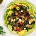 400 г рыбы горячего копчения 3 картофелины 100 г цветной капусты 100 г стручковой фасоли (или консервированного зеленого горошка) 2 яйца 2 свежих огурца 2 помидора майонез соль листья салата маслины По отдельности отварить картофель, капусту, фасоль и яйца. Вареную цветную капусту разделить на соцветия. Фасоль, картофель и яйца очистить, нарезать кубиками. Огурцы и помидоры также нарезать кубиками. Рыбу очистить от кожи и костей, разделить на небольшие кусочки. В салатник выложить подготовленные продукты, посолить по вкусу и заправить майонезом. Готовый салат подавать на листьях салата, украсив маслинами.