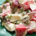 250 г мяса крабов 100 г майонеза 2 ст.л. лимонного сока 1 красная луковица 100 г маринованных фруктов (слива, вишня, яблоки) 50 г каперсов 50 г корнишонов 2 вареных яйца соль, сахар по вкусу Мясо крабов очистить от костных пластинок, разрезать на небольшие кусочки. Лук нарезать тонкими полукольцами. Корнишоны мелко нарезать. У маринованных плодов удалить косточки, некрупно нарезать. Смесь овощей и фруктов заправить майонезом, добавить каперсы, соль и сахар по вкусу. Добавить крабовое мясо, сбрызнуть лимонным соком.