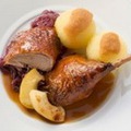 1,5 кг утиного мяса 50 г сливочного масла 2 ст.л. растительного масла 1 стак. куриного бульона 20 г крахмала сок 1 лимона Подготовленную тушку утки обжарить в растопленном масле со всех сторон. Переложить в толстостенную кастрюлю, посолить, поперчить, залить бульоном, накрыть крышкой и тушить на слабом огне около 2х часов. Образовавшийся сок процедить, добавить крахмал и лимонный сок. Получившийся соус подавать в соуснике к мясу утки.
