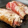 4 куска говяжьей вырезки (по 100 г) 25 г муки 2 ст.л. растительного масла 2 луковицы 150 мл красного вина (сухого) 1 ст.л. томатной пасты Для начинки: 50 г панировочных сухарей, 50 г измельченного арахиса, 1 яйцо, 1 ч.л. измельченной петрушки, 1/4 ч.л. сухого орегано, 1/4 ч.л. тимьяна. Сделать начинку: яйцо взбить, добавить все ингредиенты для начинки, все перемешать. Разделить на 4 части. На каждый кусочек вырезки положить начинку, свернуть в рулет. Каждый рулетик перевязать тонкой ниткой и обвалять в муке. Отдельно спассеровать мелко нарезанный лук, добавив томатную пасту и 75 мл вина. Мясные рулеты обжарить на растительном масле в течение 10 минут, подливая оставшееся вино. Затем добавить обжаренный лук и обжаривать еще 5 минут.