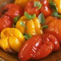 На 10 банок (0,5 л): 6,1 кг сладкого перца 510 г подсолнечного масла Необходимы зрелые, плотные и мясистые плоды перца, без повреждений. Перец промыть, обсушить и запечь на противне до тех пор, пока перец не станет мягким. Горячий перец очистить от кожицы, удалить плодоножки с семенами, плотно уложить в банки и залить прокаленным подсолнечным маслом - 2-3 ст.л. на банку емкостью 0,5 л. Залитый маслом перец накрыть крышками и стерилизовать в течение 1 часа при температуре 100С. Такой перец можно использовать для приготовления салатов.